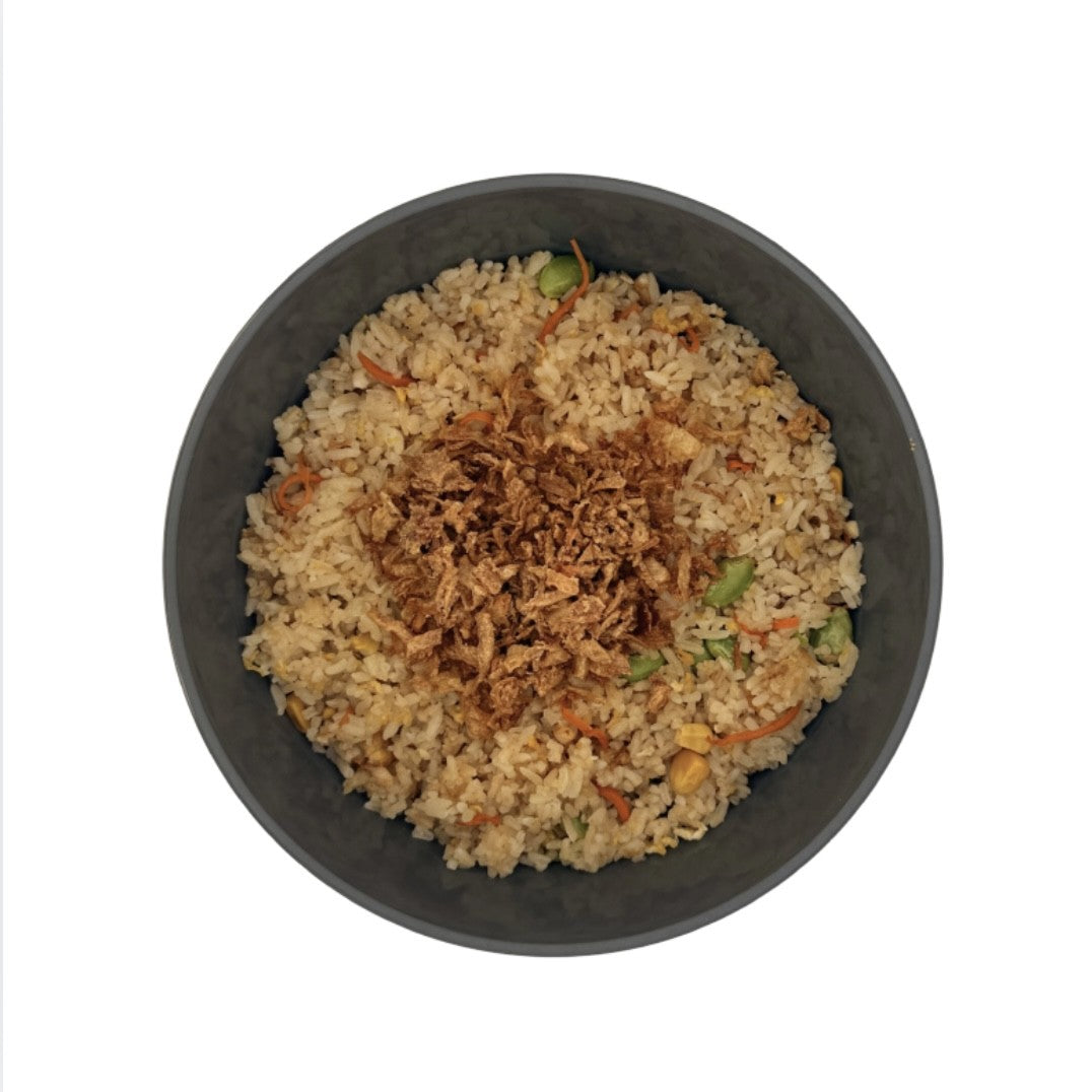 Zutaten: Jasmin-Reis, Eier , Porree, Möhren, Röstzwiebeln und Mais